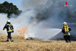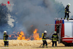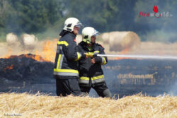 Unterstützt wurden die Löscharbeiten durch zwei Traktoren, welche die in Brand stehenden Strohballen zerteilten bzw. abgebrannte Teile einackerten. Gegen 16 Uhr konnten der Brand sowie die zahlreichen Glutnester abgelöscht werden, insgesamt standen die vier Feuerwehren mit neun Fahrzeugen und knapp 50 Mitgliedern im Einsatz. Besonders die hochsommerlichen Temperaturen gestalteten die Löscharbeiten für die Einsatzkräfte als besonders schweißtreibend. Derzeit steht die ortszuständige Feuerwehr Achau zur Brandwache vor Ort.