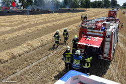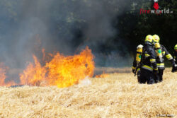 Durch die extreme Trockenheit und den zu diesem Zeitpunkt aufkommenden leichten Wind drohte der Brand auf das gesamte Feld sowie auf alle frisch gepressten Strohballen überzugreifen. Sofort wurde eine Löschleitung unter umluftunabhängigem Atemschutz vorgenommen sowie zwei weitere Feuerwehren (Biedermannsdorf und Laxenburg) nachalarmiert. Zusätzlich wurde versucht, die Brandausbreitung mit Hilfe von Feuerpatschen, Kleinlöschgeräten und zwei Löschrücksäcke zu verhindern. Durch den Einsatzleiter Bezirksfeuerwehrkommandant Stellvertreter Brandrat Christian Giwiser wurden die nachrückenden Kräfte taktisch so positioniert um eine weitere Brandausbreitung zu stoppen bzw. die bereits in Brand stehenden Strohballen und die landwirtschaftlichen Maschinen zu löschen.