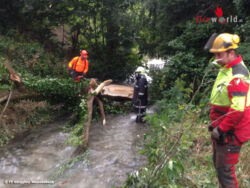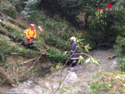 Bei der Ankunft am Einsatzort zeigte sich, das sich mehrere Bäume über dem Bach und folglich auf der Strasse befanden. Mittels Seilwinde und dem Greifer der Stadtgemeinde Gloggnitz konnten die Bäume aus dem Bach entfernt werden. Danke an den Bauhof Gloggnitz für die Unterstützung und sehr gute Zusammenarbeit!