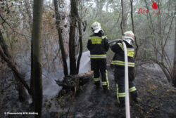 Um 08.00 Uhr rückten daher die meistens Einsatzkräfte wieder ein. Eine Versorgungsleitung blieb bestehen und eine Brandwache wurde gestellt um ein Wiederaufflammen zu verhindern. Insgesamt waren sieben Freiwillige Feuerwehren mit 26 Fahrzeugen und 140 Einsatzkräften an den Löscharbeiten beteiligt. Zur Wasserversorgung wurden 2.000 Meter B-Schläuche verlegt, für die Angriffsleitungen waren weitere 800 Meter B- und C-Schläuche notwendig. Die betroffene Waldfläche wurde mit ca. 1.200 Quadratmeter geschätzt, die Brandursache ist noch Teil der Ermittlungen.