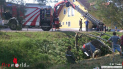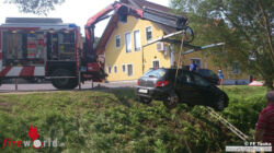Da das Fahrzeug eine extreme Schräglage hatte, musste die Feuerwehr Jennersdorf nachalarmiert werden, um die Bergung mittels Kran des Schweren Rüstfahrzeuges (SRF) vorzunehmen. Zuvor mussten Bäume, welche über das Auto hingen, entfernt werden. Das Fahrzeug konnte daraufhin ohne größere Schäden geborgen werden.
