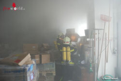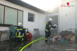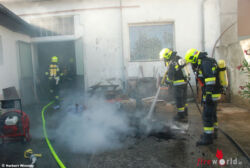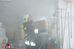 Obwohl der Besitzer erste Löschmaßnahmen mit einem Gartenschlauch unternommen hatte, begab sich ein Atemschutztrupp mit einem C-Rohr in die Halle. Dort wurden einige Kisten mit Pflegeartikeln in Brand vorgefunden. Um den Wasserschaden möglichst gering zu halten, wurden sämtliche Schachteln ins Freie getragen und mit einem HD-Rohr abgelöscht. Zur Unterstützung der Bergearbeiten wurde ein zweiter Atemschutztrupp ins Objekt geschickt sowie ein dritter Trupp in Reservestellung gebracht.