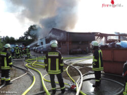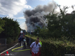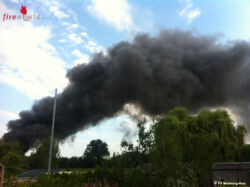 BEDBURG-HAU (DEUTSCHLAND): Großbrand gegen 8:00 Uhr des 22. Juli 2015 in Bedburg-Hau. Die Lagerhalle eines Dachdeckerbetriebes in Hasselt stand in Vollbrand. Die Rauchsäule war kilometerweit, sogar bis nach Emmerich sichtbar. Die Löscharbeiten dauerten fünf Stunden. Verletzt wurde niemand. Die Halle brannte vollständig aus und ist einsturzgefährdet.