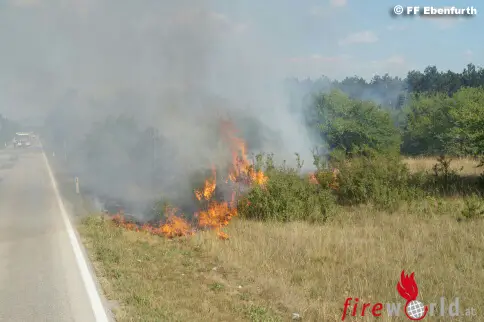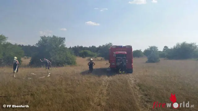 EBENFURTH (NÖ): Am Mittwoch, den 22. Juli 2015, um 16:26 Uhr wurden die Feuerwehren der Stadt Ebenfurth sowie Haschendorf, Siegersdorf, Felixdorf, Sollenau und Wr. Neustadt (GTLF) mittels Sirene zu einem Flurbrand nach Grossmittel gerufen. Hier war das Trockengrasbiotop sowie auch schon einige Schwarzföhren in Brand geraten.