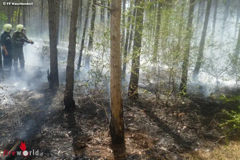 HASCHENDORF (NÖ): Am 23.07.2015 wurde die FF Haschendorf innerhalb von vier Stunden zu drei Brandeinsätze nach Großmittel alarmiert. Um 10:17 Uhr erfolgte die erste Alarmierung zu einem Flurbrand am GÜPL Großmittel. Zunächst wurde vermutet, dass sich der Waldbrand vom Vortag (22.07.2105) wieder entzündet hat.