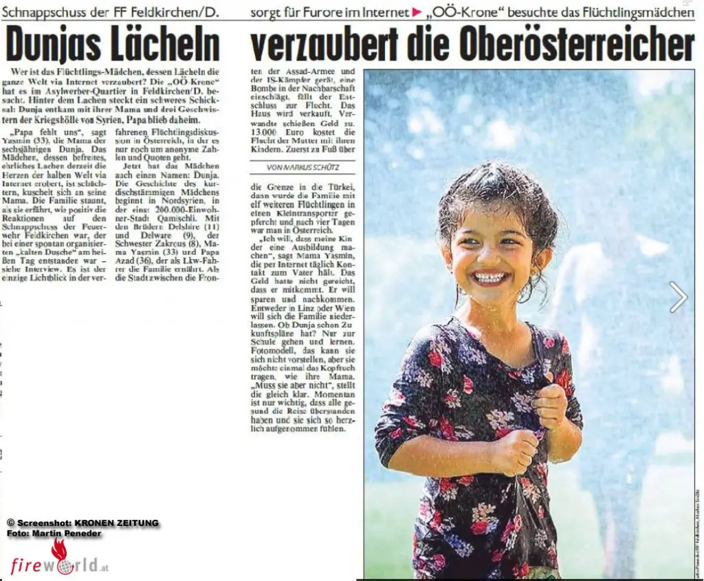 Mit dem Foto des strahlenden Kindes gelang es Martin Peneder von der Feldkirchner Feuerwehr auf eine im Grunde "kleine", aber mehr als menschliche Aktion nicht nur hinzuweisen, sondern diese fast durch die Welt zu schleudern. Der Oberösterreichischen Kronenzeitung ist dies per 23. Juli 2015 nochmals eine eigene Reportage wert.