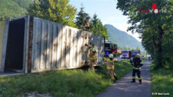 BAD ISCHL (OÖ): Gerade als die FF Bad Ischl von einem Ölaustritt am Schröpferplatz um 08:40 Uhr eingerückt war, folgte um 08:41 Uhr des 23. Juli 2015 die nächste Alarmierung. Auf der B145 in Langwies verunfallte ein Lkw-Zug. Dabei kam der Anhänger des Fahrzeuges seitwärts zu liegen.