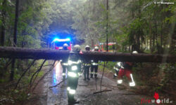 Von umgestürzten Bäumen blockierte Straßen mussten ebenfalls, z.B. in Wörth, wieder durchgängig gemacht werden. In Lafnitz war ein Wirtschaftsgebäude von einem durch Blitzschlag getroffenen Baum akut gefährdet. Hier führten die Einsatzkräfte Baumsicherungsarbeiten durch.