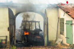 Gleich zu Beginn übernahmen die Feuerwehrkameraden zunächst den Schutz des angrenzenden Wohnhauses und konnten dieses somit erfolgreich gegen die Flammen verteidigen. Die weiteren Feuerwehren übernahmen das Ablöschen der Scheune. Aufgrund der hohen Brandlast durch gelagertes Brennholz musste ein umfassender Löschangriff mit sechs Löschleitungen vorgenommen werden. Zwei Traktoren und die Scheune vielen dem Feuer zum Opfer.