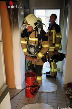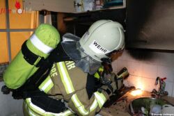 Eingewiesen durch beobachtende Passanten, konnte ein Atemschutztrupp rasch zur betroffenen Wohnung vordringen. Der Mieter hatte den Brand in der Küche bereits erfolgreich bekämpft und empfing, etwas erschöpft, die Einsatzkräfte an der Tür. Mittels Wärmebildkamera wurde der Küchenbereich kontrolliert und Nachlöscharbeiten über eine Kübelspritze durchgeführt. Das ebenfalls rasch eingetroffene Rettungsteam kümmerte sich in der Zwischenzeit bereits um den glücklicherweise, unverletzten Hausherrn. Es folgten weitere Messungen mit der Wärmebildkamera und geringfügige, notwendige Demontagen an der Kücheneinrichtung, um sämtliche Brandstellen ablöschen zu können.