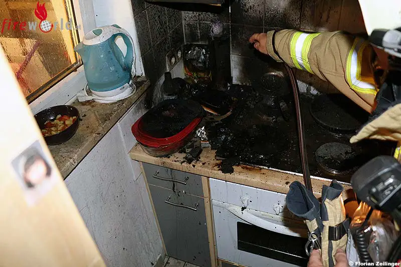 Eingewiesen durch beobachtende Passanten, konnte ein Atemschutztrupp rasch zur betroffenen Wohnung vordringen. Der Mieter hatte den Brand in der Küche bereits erfolgreich bekämpft und empfing, etwas erschöpft, die Einsatzkräfte an der Tür. Mittels Wärmebildkamera wurde der Küchenbereich kontrolliert und Nachlöscharbeiten über eine Kübelspritze durchgeführt. Das ebenfalls rasch eingetroffene Rettungsteam kümmerte sich in der Zwischenzeit bereits um den glücklicherweise, unverletzten Hausherrn. Es folgten weitere Messungen mit der Wärmebildkamera und geringfügige, notwendige Demontagen an der Kücheneinrichtung, um sämtliche Brandstellen ablöschen zu können.