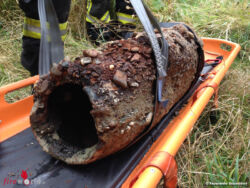 Nach dem Eintreffen untersuchte der Sprengmeister das Kriegsrelikt: Der Zünder war nicht mehr vorhanden, aber der Rohrkörper noch gut zu zwei Drittel mit Sprengstoff gefüllt. Mit Trageunterstützung der Mannschaft vom zweiten Löschfahrzeug mit dem Kürzel "07-HLF20-02" der Feuerwache Werstener Feld, übernahm das Team der Entschärfer die Bombe am Transportfahrzeug des Landes, welches auf festem Untergrund stand. Dazu hatte die Feuerwehr eine "Schleifkorbtrage" als Transportbehälter eingesetzt. Der Einsatz endete gegen 19 Uhr.