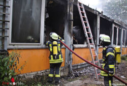 AHRENSBURG (DEUTSCHLAND): Ein Großfeuer hat am Sonntagabend, 26. Juli 2015, eine Handwerkerunterkunft im Ahrensburger Ortsteil Wulfsdorf (Stormarn) völlig zerstört. Das etwa 25×15 Meter große Gebäude – ein Flachdach-Pavillon aus den 70er Jahren – liegt im Außenbereich von Wulfsdorf und wurde gewöhnlich von zehn polnischen Handwerkern bewohnt, die mit der Verlegung von Erdkabeln für das schnelle Internet in Stormarn beschäftigt sind