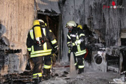 Unterdessen gingen sieben Trupps unter Atemschutz im Außenangriff gegen die Flammen vor. Ein Innenangriff war wegen großer Hitzeeinwirkung nicht mehr möglich; ebenso mussten Überlegungen verworfen werden, das Feuer über das etwa 100 Quadratmeter große Flachdach zu bekämpfen. "Hier hinderten uns Platten aus dicker Teerpappe am Öffnen der Dachfläche", so Haarländer. Die Löschwasserversorgung wurde aus zwei, 400 Meter entfernten Hydranten sichergestellt. Zur Brandbekämpfung wurden fünf C-, zwei B- Leitungen und sieben Strahlrohre vorgenommen. Die eingesetzten Wehren waren mit 88 Kameradinnen und Kameraden vor Ort.