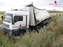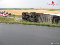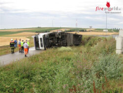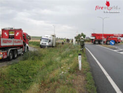 JETZELSDORF (NÖ): Am 27. Juli 2015 wurden die Feuerwehren Hollabrunn und Jetzelsdorf um 7:12 Uhr zu einer Lkw-Bergung beim letzten Kreisverkehr vor dem Grenzübergang Kleinhaugsdorf alarmiert. Beim Eintreffen der Einsatzkräfte bot sich folgendes Bild: