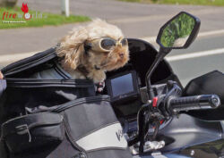 Mein Herrchen hat mir erst kürzlich eine super bequeme Tasche für unsere Ausflüge gekauft. Die wird ganz vorn auf den Bock montiert. So habe ich beste Sicht und spüre jede Vibration. Dazu hat er mir noch diese affenscharfe Brille besorgt. Wir hatten es einmal ohne probiert. Aber die Fliegen habe ich mir noch Wochen später aus den Augen gepult. Und das Geld für den Tierarzt kann mein Herrchen so nun in Kauknochen investieren.