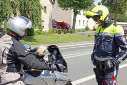 Gegen Mittag sind wir endlich los. Ich habe vor Aufregung mein Futter gar nicht runter bekommen. Quer durch das Sauerland sind wir schließlich in Meinerzhagen gelandet. Und als hätte ich es nicht bereits einen Kilometer vorher gegen den Wind erschnüffelt, hüpft plötzlich so ein Verrückter in blauer Montur hektisch mit einer Kelle winkend auf der Landstraße rum.