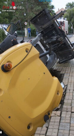 Kaum hatten sie diesen jedoch am Ort des Gebrechens in Stellung gebracht, gab der Untergrund krachend nach und das Gefährt kippte in das sich auftuende Loch. Der Fahrer wurde dabei leicht verletzt und begab sich daraufhin selbst in ärztliche Behandlung. Der restliche Bautrupp stellte schnell fest, dass der Bagger mit herkömmlichen Mitteln nicht mehr aus seiner verzwickten Lage zu bergen sein würde. Daher veranlassten die Gemeindearbeiter – selbst Feuerwehrkameraden – die Alarmierung der Feuerwehr Kirchberg am Wagram und des Kranfahrzeuges aus der Bezirkshauptstadt Tulln.