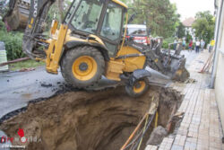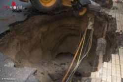 Schließlich wurde an drei verschiedenen Punkten am Bagger angeschlagen: Mit dem Greifzug wurde seitlich abgesichert, die Seilwinde des Rüstlöschfahrzeuges sorgte für die nötige Spannung nach vorne und der Kran hob die Arbeitsmaschine Stück für Stück aus dem Loch. So gelang es den ansonsten kaum beschädigten Bagger wieder auf festen Boden zu stellen. Immer wieder musste dabei auch der in der Straße verlegte „Kabelsalat“ ausgefädelt werden. Unterhalb des ausgeschwemmten Loches in der Größe mehrerer Kubikmeter kam das Gewölbe eines Kellers zum Vorschein, der anscheinend das Wasser geschluckt und abgeleitet hatte.