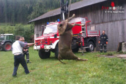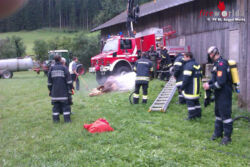 ST. AEGYD MARKT (NÖ): „Kuh in Güllegrube“ lautete am 28.07.2015 um 05.21 Uhr die Alarmierung für die Feuerwehren St. Aegyd Markt und BTF Roth GmbH. Bei einem Landwirt im Seebachtal war eine Kuh im Laufe der Nacht durch eine morsche Holzabdeckung in die Güllegrube gestürzt und konnte sich nicht mehr alleine befreien.