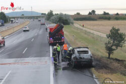 WIENER NEUSTADT (NÖ): Zu einem Fahrzeugbrand auf der A2 rückte die Freiwillige Feuerwehr Wiener Neustadt am Dienstagmorgen, 28. Juli 2015, aus. Aufgrund der starken Rauchentwicklung meldeten sich gleich mehrere Anzeiger bei der Bezirksalarmzentrale. Die Feuerwehr konnte den Brand rasch löschen. Am Pkw entstand Totalschaden. Verletzt wurde niemand.