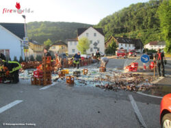 STEINEN (DEUTSCHLAND): Am frühen Donnerstagmorgen, 30. Juli 2015, hat in Steinen ein Getränkelaster einen Teil seiner Ladung verloren und ein erhebliches Splitterfeld auf der Straße hinterlassen.
