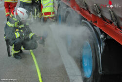 Unter Vornahme eines C-Rohres sowie Atemschutz wurde der betroffene Bereich am Lkw abgekühlt. Dies zeigte rasch Wirkung. Nach der Kontrolle mittels Wärmebildkamera konnte die Feuerwehr gemeinsam mit den Mitarbeitern (Traffic Manager) der ASFiNAG Umbauarbeiten an der Bremsanlage vornehmen, um eine provisorische Einspeismöglichkeit zur Fremdversorgung mittels Druckluft über das 1. HLF zu schaffen. Dadurch konnte die Bremsanlage gelöst und der defekte Lkw zum Abschleppen vorbereitet werden.