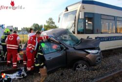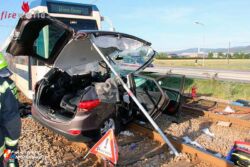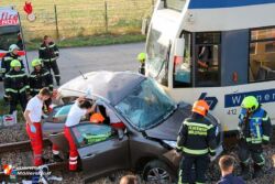 Eine Person wurde im stark deformierten Fahrzeug eingeklemmt und schwer verletzt. Von der Feuerwehr Möllersdorf wurde nach dem Eintreffen am Unfallort, der Brandschutz aufgebaut, gemeinsam mit der Polizei die Unfallstelle abgesichert, der gesamte Eisenbahnverkehr gesperrt, das Notarztteam des Roten Kreuzes unterstützt und die Vorbereitungen zur Rettung der Person getroffen. Ebenso war ein Christophorus Hubschrauber vor Ort um die verunfallte Person schnellstmöglich in das Krankenhaus zu fliegen.