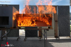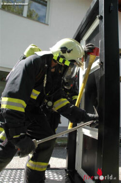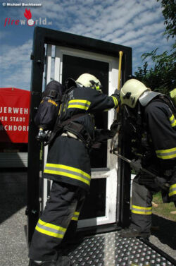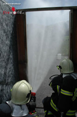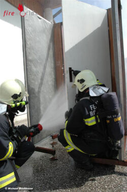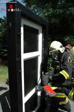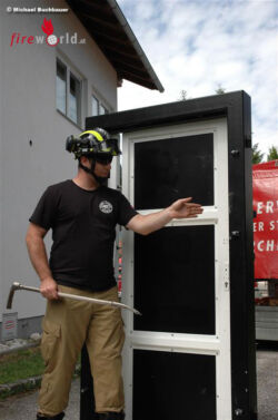 Parallel zu der Türöffnung wurden aktive Atemschutzträger theoretisch und praktisch über aktuelle Themen im Bereich Atemschutzeinsatz geschult. Die Themen waren hier unter andern der Atemschutznotfall, Brandverlauf, Flash Over – Backdraft, Schlauchtragekorb, Schlauchpaket, Strahlrohrtraining und Öffnen einer versperrten Türe in den Brandraum.