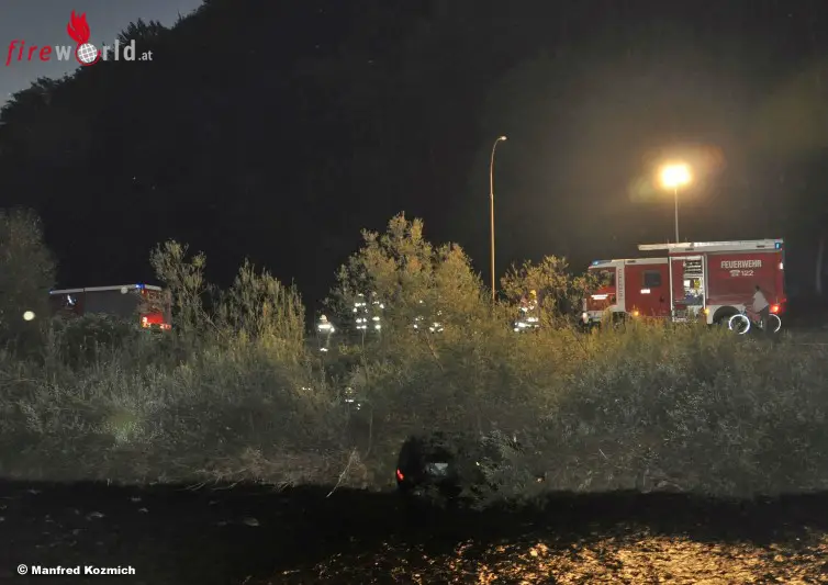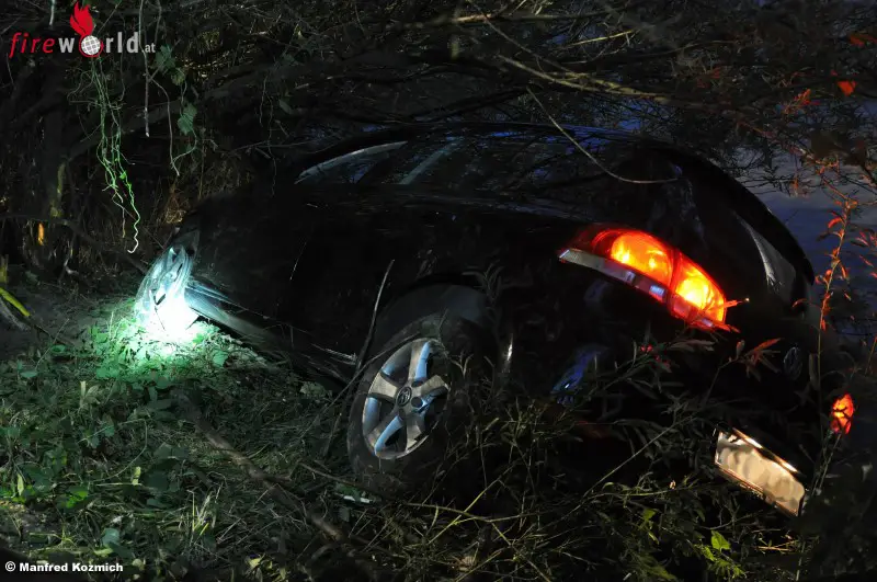 SCHRAMBACH (NÖ): In der Nacht auf Samstag, den 08.08.2015, heulten um 04.45 Uhr die Sirenen der Schrambacher Feuerwehr. Ein junger Fahrzeuglenker aus Hohenberg war mit seinem VW-Golf am Nachhauseweg von der B-20 abgekommen und mit der rechten Seite seines Fahrzeugs im Bachbett gelandet.
