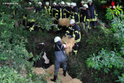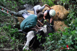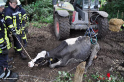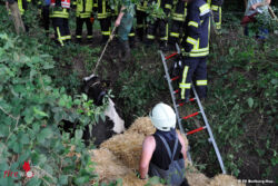Um zunächst ein weiteres Absinken zu verhindern, wurde der Gaben um die Kuh mit Strohballen aufgefüllt und die Kuh mit Seilen gesichert. Ein verständigter Tierarzt brachte eine Klemme an, so dass die Kuh durch einen Teleskoplader und die geballte Kraft der Feuerwehrmänner aus ihrer Lage befreit werden konnte. Das sichtlich erschöpfte Tier wurde dann zur weiteren Untersuchung durch den Tierarzt auf die angrenzende Weide gebracht.