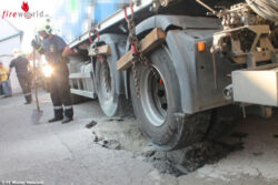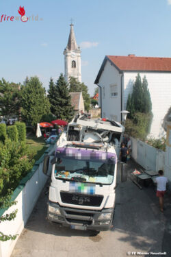 WIENER NEUSTADT (NÖ) / BAUMGARTEN (BGLD): Zur Unterstützung ins Burgenland rückte die Feuerwehr Wiener Neustadt am 10. August 2015 aus. In Baumgarten, Bez. Mattersburg, brach ein Lkw in die Straße ein und blieb stecken. Erst der schwere Kran konnte den Spülwagen heben und bergen. Verletzt wurde niemand.