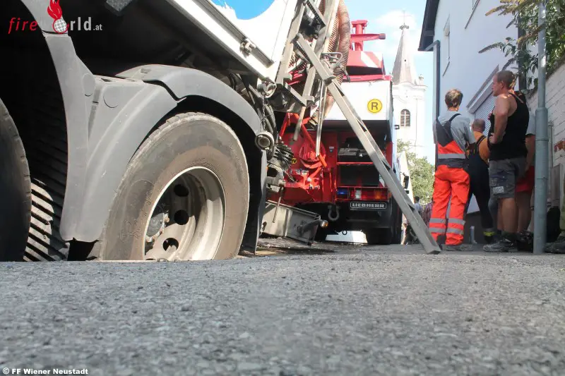 WIENER NEUSTADT (NÖ) / BAUMGARTEN (BGLD): Zur Unterstützung ins Burgenland rückte die Feuerwehr Wiener Neustadt am 10. August 2015 aus. In Baumgarten, Bez. Mattersburg, brach ein Lkw in die Straße ein und blieb stecken. Erst der schwere Kran konnte den Spülwagen heben und bergen. Verletzt wurde niemand.