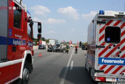 Dabei waren drei Pkw beteiligt, einer davon überschlug sich mehrfach und kam erst ca. 60 Meter nach der Unfallstelle auf der rechten Fahrspur zum liegen. Ein anderes Fahrzeug schleuderte quer über alle drei Spuren und kam entgegen der Fahrtrichtung zum stehen.