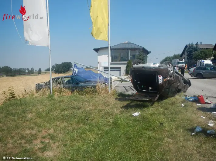 Zwei Pkw waren zusammengestoßten, wobei ein Auto am Dach zum Liegen kam. Beim Eintreffen der Feuerwehr waren die verletzten Personen bereits befreit. Die Feuerwehr Scharnstein sicherte die Einsatzstelle ab, unterstützte das Rote Kreuz bei den Versorgungsmaßnahmen und übergab im Anschluss die Einsatzstelle der örtlich zuständigen Feuerwehr Steinfelden, die nach Abschluss der Erhebungsarbeiten die Aufräumungsarbeiten durchführten. Einsatzende: 12:47 Uhr.