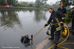 Der Mann konnte sich noch aus eigener Kraft am Ufer festhalten. Weitere herbeigeeilte Passanten sicherten ihn. Mit Hilfe der eintreffenden Einsatzkräfte der Feuerwehr wurde er an Land gezogen. Er wurde sofort vom Notarzt versorgt und anschließend mit einem Rettungswagen in ein Mülheimer Krankenhaus gebracht. Durch Feuerwehrtaucher wurde anschließend der Rollstuhl aus der Ruhr geborgen. Der Einsatz für die Feuerwehr, die mit einem Großaufgebot ausgerückt war, dauerte zirka 1 Stunde und 30 Minuten. An dieser Stelle einen herzlichen Dank an die Ersthelfer vor Ort. Sie alle haben sich vorbildlich verhalten und so dazu beigetragen ein Menschenleben zu retten.