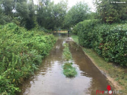 EBENFURTH (NÖ): Am Montag, den 17. August 2015, wurde die Feuerwehr der Stadt Ebenfurth um 07:46 Uhr mittels Sirene zu einem Hochwassereinsatz alarmiert. Durch eine Verklausung im Mühlbach und durch die starken Regenfälle in der vergangenen Nacht trat der Mühlbach im Bereich der Kleingartensiedlung über die Ufer.