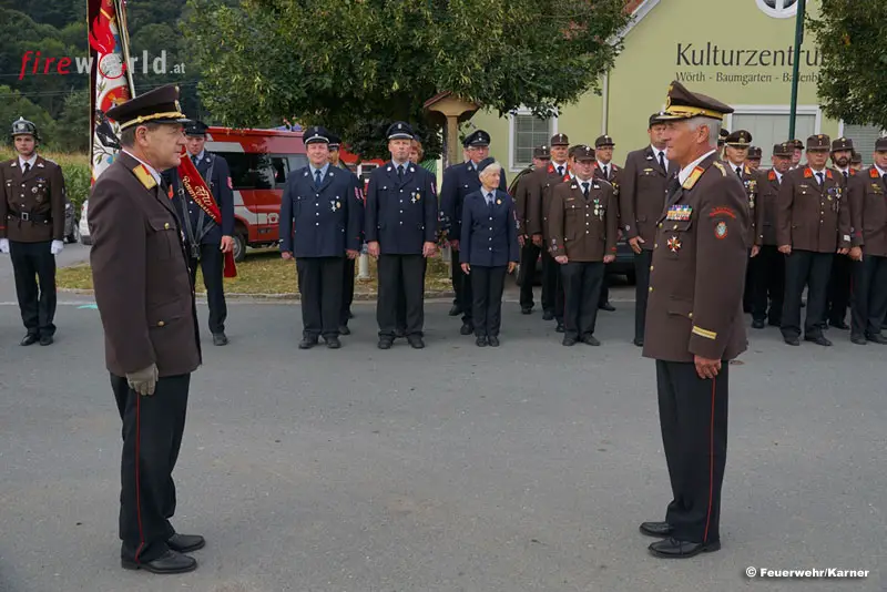 Kommandant Josef Marbler konnte neben der zahlreich anwesenden Ortsbevölkerung auch einige Ehrengäste begrüßen. Darunter waren Landesbranddirektor-Stv. Gerhard Pötsch, Bereichskommandant Johann Kienreich, Abschnittsbrandinspektor Walter Schleich sowie 110 Mitglieder von benachbarten Feuerwehren. Aber auch Ehrengäste aus der Politik folgten der Einladung der FF Baumgarten. So haben unter anderem LAbg. Franz Fartek, Bgm. Gerhard Meixner und 2. Vize-Bgm. Elisabeth Triebl der Feierlichkeit beigewohnt. Weit angereist war auch eine Abordnung der Partnerfeuerwehr Baumgarten aus Niederbayern.