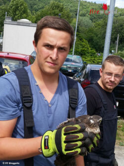 GLOGGNITZ (NÖ): Als die Einsatzkräfte am 24. August 2015 von einem Einsatz von der Semmeringschnellstraße im Feuerwehrhaus eingerückt waren, wurden diese telefonisch von einer Privatperson über einen flugunfähigen Bussard verständigt.