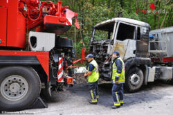 Ein Mittelschaumrohr zur Brandbekämpfung für den LKW sowie ein C Rohr für den Waldbrand wurden parallel vorgenommen. Der effektive Einsatz zeigte rasch einen Erfolg. Um diese von Lastkraftwagen stark frequentierte Straße für den Verkehr wieder freizubekommen rückte das Feuerwehr-Kranfahrzeug an und barg das Wrack. Nach drei Stunden konnten die Einsatzkräfte der Feuerwehr Gaaden, Hinterbrühl und Mödling wieder einrücken.