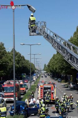 Während die Besatzung eines Rettungswagens des Roten Kreuzes sowie der Notarzt Mitte die Versorgung des Patienten übernahmen, sicherten die Einsatzkräfte der Feuerwehr die Unfallstelle ab. Der abgebrochene Scheinwerfer des Lichtmast wurde von der Drehleiter gesichert, um ein herunterfallen und eine weitere Gefährdung zu vermeiden.