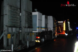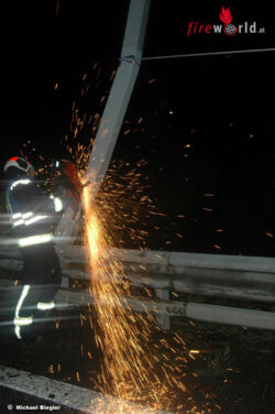 Des Weiteren mussten die Feuerwehrmänner mit Hilfe von Ladekran, Rundschlingen und dem Winkelschleifer einen Lichtmast, welcher durch den Unfall schwer beschädigt wurde, abschneiden und gesichert ablegen. Im Anschluss an diese Sicherungsarbeiten konnte der verunfallte Lkw mit dem Großtanklöschfahrzeug, kurz GTLF, in die nächst gelegene Pannenbucht geschleppt werden. Während dieser Bergungsmaßnahmen war die Auffahrtsrampe komplett gesperrt.