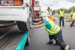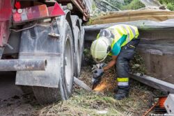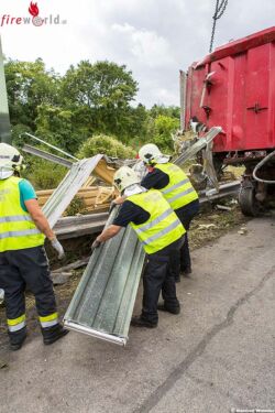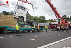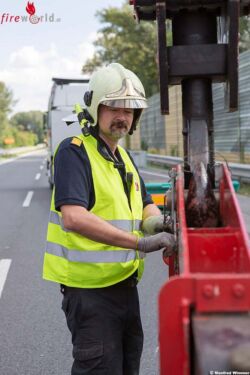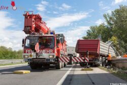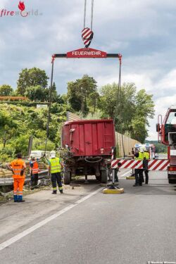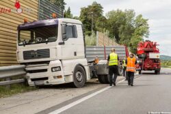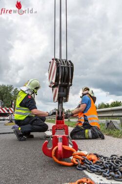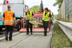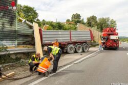 Nach erfolgter Sperre konnte das Fahrzeug auf einen Tieflader gehoben und abtransportiert werden. Der Sattelanhänger konnte in einem weiteren Arbeitsschritt aus der Lärmschutzwand geborgen, und auf die Fahrbahn gestellt werden. Da die Beschädigungen am Sattelanhänger einen Abtransport auf der Straße ermöglichten wurde ein geeignetes Sattelzugfahrzeug zum Abtransport angefordert.