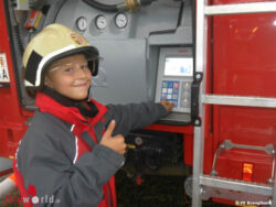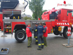 Im Feuerwehrhaus konnten die Jugendlichen noch die Ausrüstung der Höhenretter bestaunen, bevor kurz vor Mittag noch die Teleskopmastbühne der Feuerwehr Sattledt in Krenglbach ankam. Ein im wahrsten Sinn des Wortes Highlight – die Burschen durften bis auf 32 Meter mit hinauffahren; tolle Aussicht inklusive.