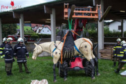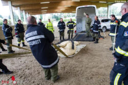 Dank dem Bundesgestüt Piber musste die im Anschluss folgende praktische Ausbildungseinheit nicht im strömenden Regen durchgeführt werden, eine der Trainingshallen stand den Teilnehmern zur Verfügung. Hier wurde das Rettungs-Equipment erklärt und aufgezeigt, dass mit nur wenigen Einsatzmitteln ca. 90 Prozent der Unfälle beherrscht werden können – nur für rund 10 Prozent bei Einsätzen dieser Art wird ein Kran benötigt.
