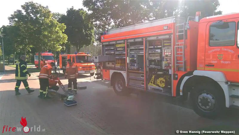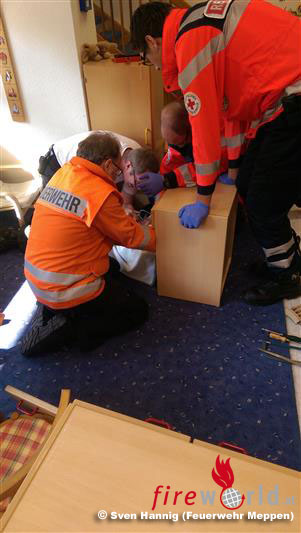 MEPPEN (DEUTSCHLAND): Die Feuerwehr Meppen wurde um 10:37 Uhr des 9. September 2015 mit dem Stichwort „eingeklemmten Person“ in den Kindergarten nach Versen gerufen. Eine nicht alltägliche Situation erwartete die Einsatzkräfte vor Ort.