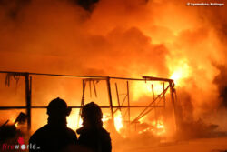 Langwierig gestalten sich die Nachlöscharbeiten. Hierzu wird das Brandgut mit einem Kran der Entsorgungsfirma auseinander gezogen und die Glutnester abgelöscht. Die Nachlöscharbeiten dauern über mehrere Stunden an. Anschließend wurde zur Sicherheit eine Brandwache vor Ort belassen.