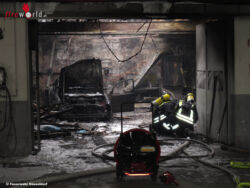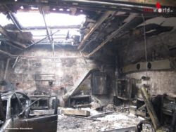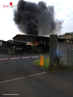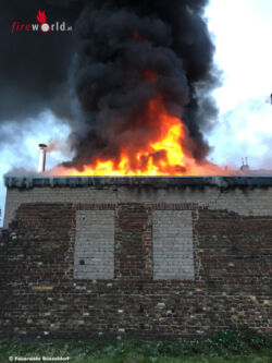 Bereits auf der Anfahrt war eine starke Rauchentwicklung feststellbar. Bei Eintreffen des ersten Löschzuges schlugen Flammen meterhoch aus dem Flachdach einer ca. 10 m x 10 m großen eingeschossigen Werkstatthalle, die im Innern schon vollständig brannte. Der Betreiber der Autolackiererei und eine weitere Person hatten zu diesem Zeitpunkt bereits den Versuch unternommen, den Brand mit betriebseigenen Feuerlöschern zu bekämpfen und hatten dabei giftigen Brandrauch eingeatmet. Beide wurden vom mitalarmierten Notarzt und den unterstützenden Rettungsdienstkräften vor Ort medizinisch erstversorgt und anschließend zur weiteren Behandlung in ein Krankenhaus transportiert.