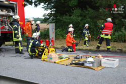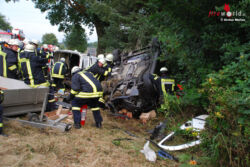 Die weibliche Insassin konnte das Fahrzeug nicht selbständig verlassen. Nach dem die Feuerwehr Schenefeld-Siezbüttel an der Einsatzstelle eintraf, wurde umgehend der zweifache Brandschutz sicher gestellt und sämtliche Gerätschaften für die technische Unfallrettung bereitgelegt. So konzentrierte man sich zunächst auf die Befreiung der weiblichen Person aus dem Fahrzeug. Hierfür wurde das auf dem Dach liegende Fahrzeug mit B-Druckschläuchen und Pallhölzer stabilisiert. Die Erstversorgung wurde durch das Seitenfenstern durchgeführt. Nach dem die Heckscheibe entfernt wurde, wurde die weibliche Insassin über das Heck mit einem Spinebord gerettet.