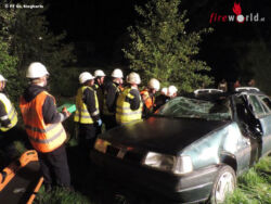 Danach war gemütliches Beisammensitzen bis um 21 Uhr die nächste Alarmierung durch den Lautsprecher kam. Verkehrsunfall in Fistritz mit Menschenrettung. Das SRF, LAST, KLF, VRF und MTF wurden besetzt und zum Einstzort nach Fistritz gefahren. Die Ortsfeuerwehr hatte die Unfallstelle bereits abgesichert. Unsere Aufgabe war, die Unfallstelle auszuleuchten, den Verletzten so schonend wie möglich aus dem Unfallfahrzeug zu retten, erstzuversorgen und mit der Korbtrage aus dem Gefahrenbereich zu bringen. Danach wurde der Pkw mit der Seilwinde von Tank Fistritz geborgen, mit dem Kran von Last Siegharts verladen und abtransportiert. Nach der Versorgung der Gerätschaft und einer kurzen Übungsbesprechung konnte wieder ins Feuerwehrhaus eingerückt werden.
